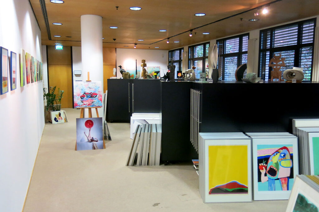 Immer wieder wechselnde Bilder oder Skulpturen erfreuen die Seele und beleben das tägliche Einerlei. Es gibt viel zu entdecken in der Artothek und vielleicht erweitert sich auch der Blick auf die Kunst. Auf jeden Fall wird die Verwandtschaft staunen.