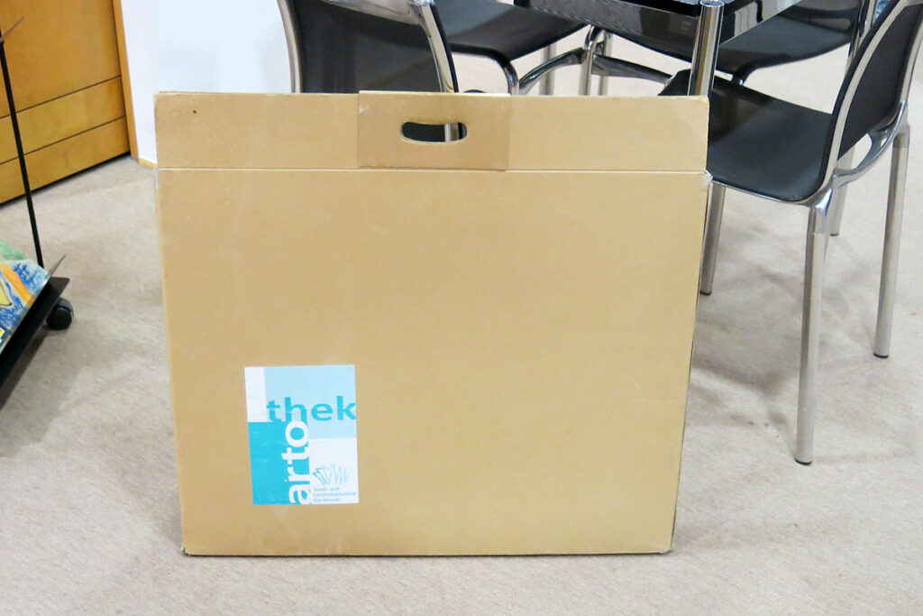 Wer ein Kunstwerk ausleihen will, kommt aus dem Staunen nicht heraus. Alle Bilder auf Papier sind gerahmt und für den Transport stehen Tragekartons in allen Größen bereit. Die Ausleihdauer beträgt 3 Monate – für ein Entgelt von 2,50 € je Kunstwerk plus einer Versicherungsgebühr von 1,00 bis 5,00 € (je nach Wert). Man kann sich also für den Preis eines belegten Brötchens ein Kunstwerk nach Hause holen. Einzige Voraussetzung ist ein Bibliotheksausweis (lohnt sich bei dem riesigen Literaturangebot sowieso).